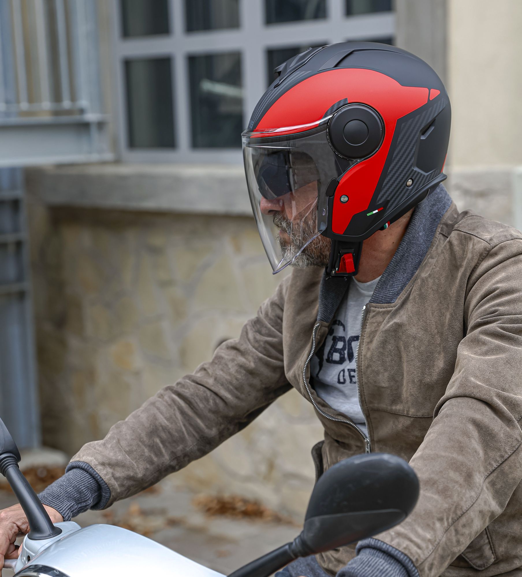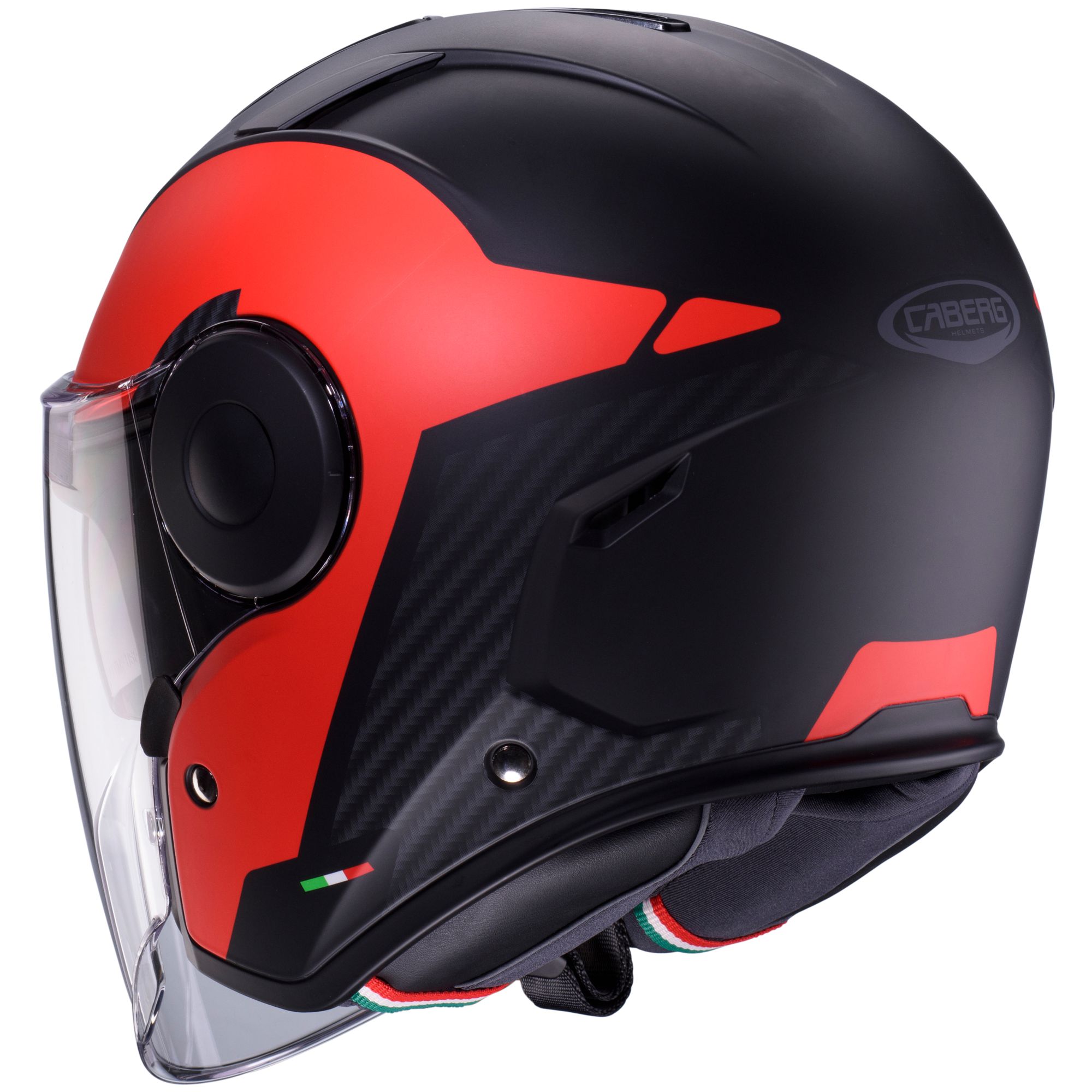 De Caberg Soho jethelm met Milano decor in de kleuren zwart/rood heeft de volgende kenmerken: