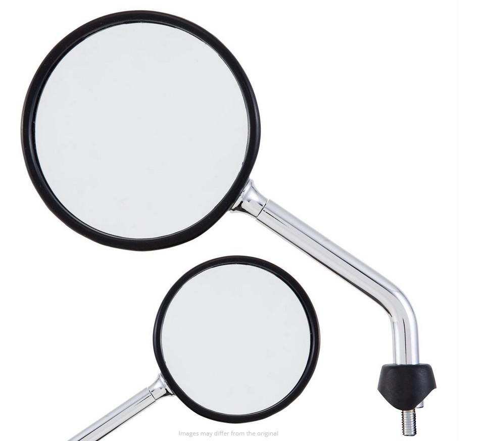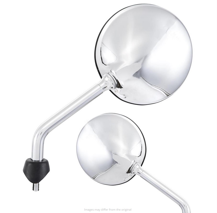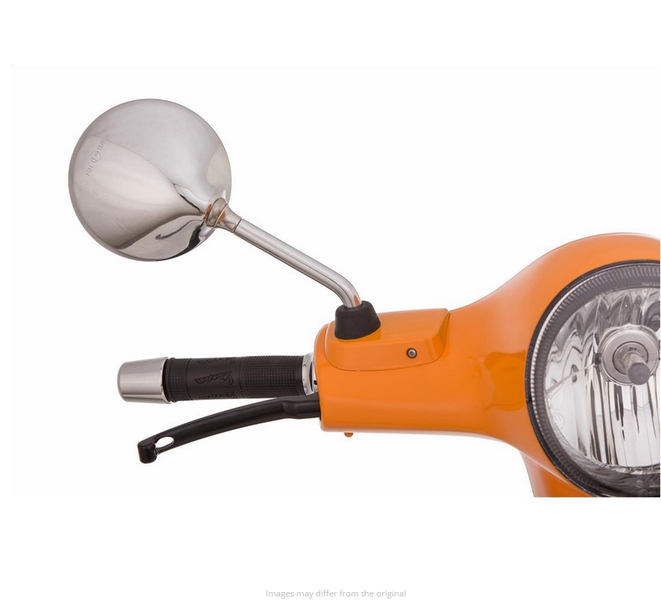 De spiegels Shorty zijn gebaseerd op de oorspronkelijke vorm van de Vespa spiegels, maar hebben een veel kortere spiegel arm. Met ca. 5-6 cm minder hendel lengte, het past perfect in het algemene uiterlijk van de Vespa. Dankzij het kogelgewricht kan de spiegelkop worden versteld, het gezichtsveld wordt ondanks de kortere hendel niet belemmerd. De spiegel heeft een E-nummer en mag zonder problemen aan het wegverkeer deelnemen. Levering inclusief rubber doppen en contramoeren.