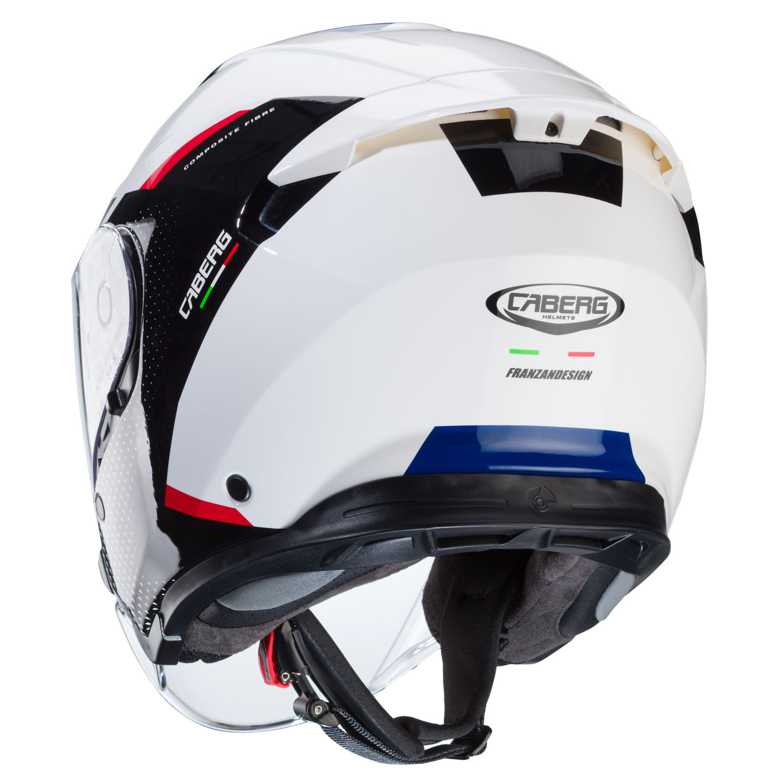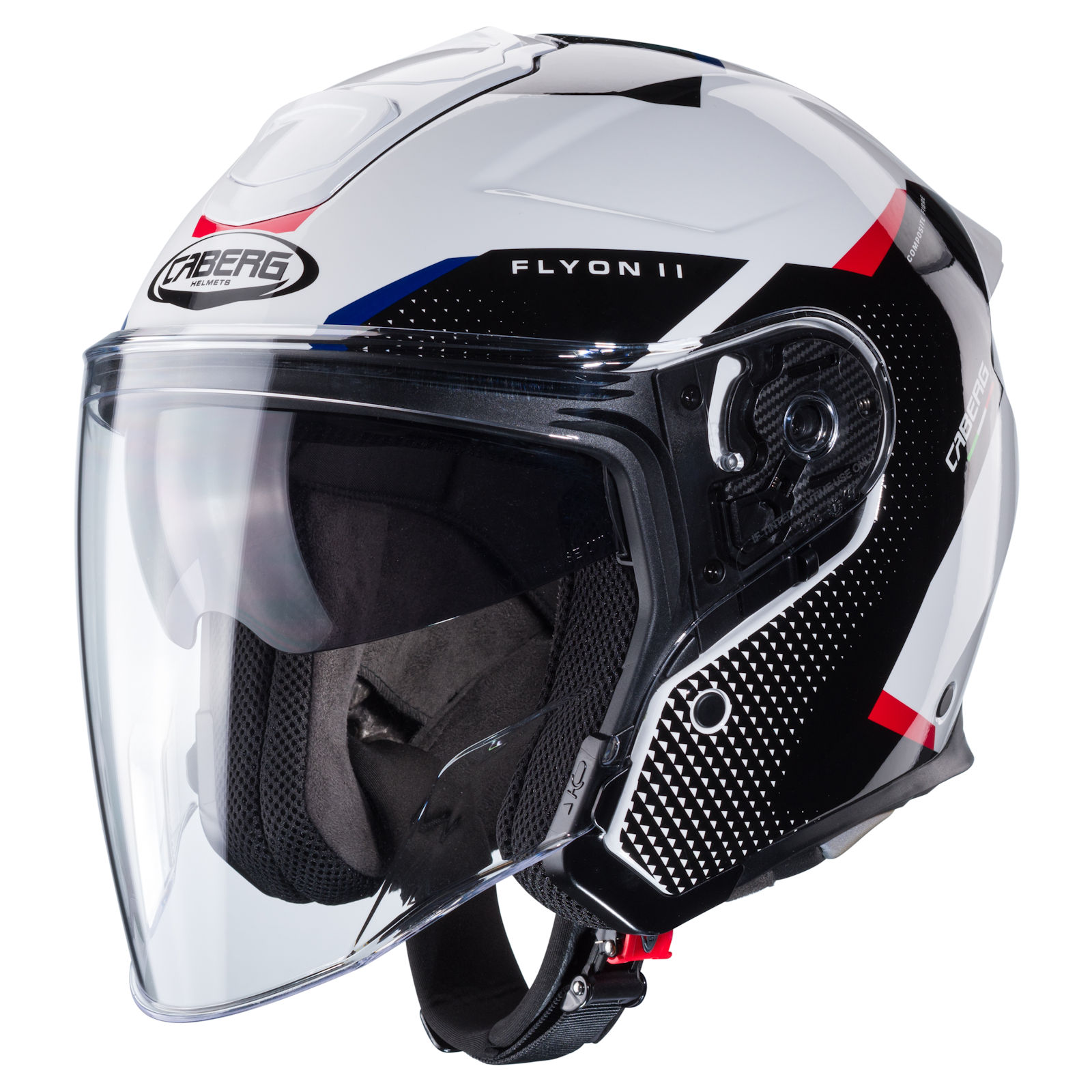 De Caberg Flyon II jethelm met het Boss decor in de kleuren wit/zwart/rood/blauw heeft de volgende eigenschappen: